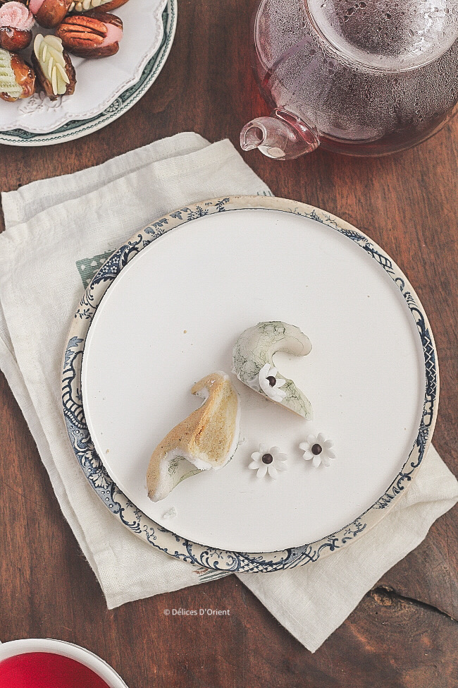 Une des innombrables pâtisseries algériennes, il s'agit d'un grand classique en forme d'hélice à trois pales assez semblable au triskèle breton. Il s'agit d'un gâteau fondant avec une farce aux amandes habituellement parfumé à la cannelle et recouvert d'une glaçage au citron. J'ai gardé la recette traditionnelle sauf pour la cannelle qui a été remplacé par de poudre de vanille déshydraté (l'association vanille et eau de fleur d'oranger fonction merveilleusement bien). Pour l'effet marbre, j'ai repris l'astuce du compte youtube de Hanaan Wa Shifaa.